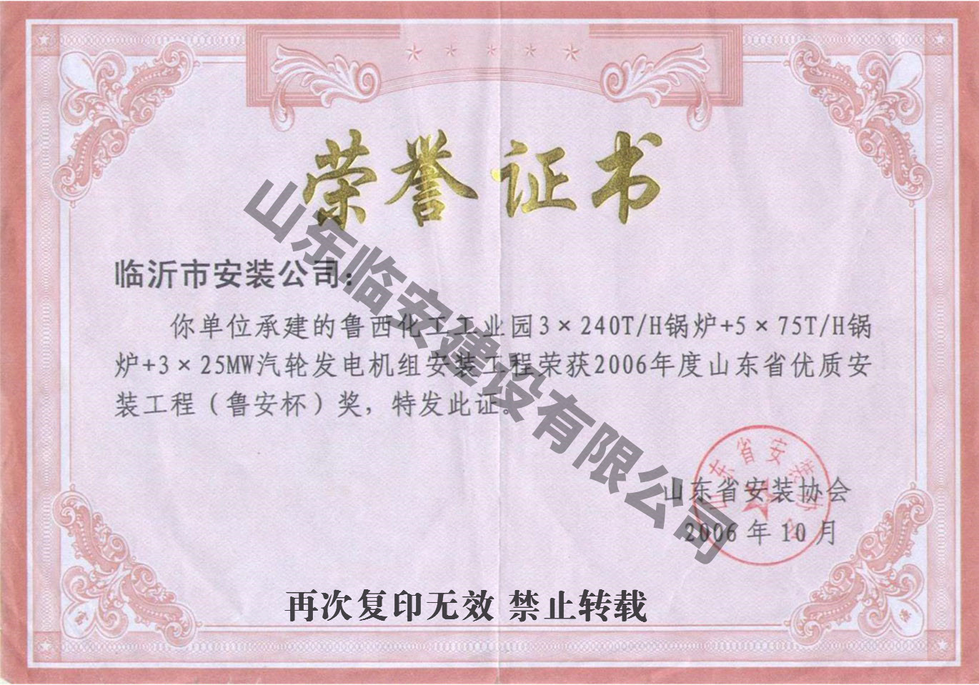山東臨安建設(shè)有限公司(原名臨沂市安裝公司)始建于一九六六年,是由老國企改制的股份制企業(yè),公司總部位于羅莊區(qū)通達(dá)路211號,現(xiàn)有職工1000余名,各類工程經(jīng)濟(jì)技術(shù)人員816名,其中高中級職稱64名,初級職稱204人。主要從事機(jī)電工程施工總承包,電力施工總承包,石油化工施工總承包,建筑裝飾裝修施工總承包,鍋爐安裝、改造I級(參數(shù)不限),GB1、GB2(2)級、GC1級、GD1級壓力管道安裝,起重機(jī)械B級安裝,電力設(shè)施承裝、承試,并取得了GB/T19001-2008質(zhì)量管理體系認(rèn)證證書、GB/T28001-2011職業(yè)健康安全管理體系認(rèn)證證書、GB/T24001-2004環(huán)境管理體系認(rèn)證證書,資信等級“AAA”級。